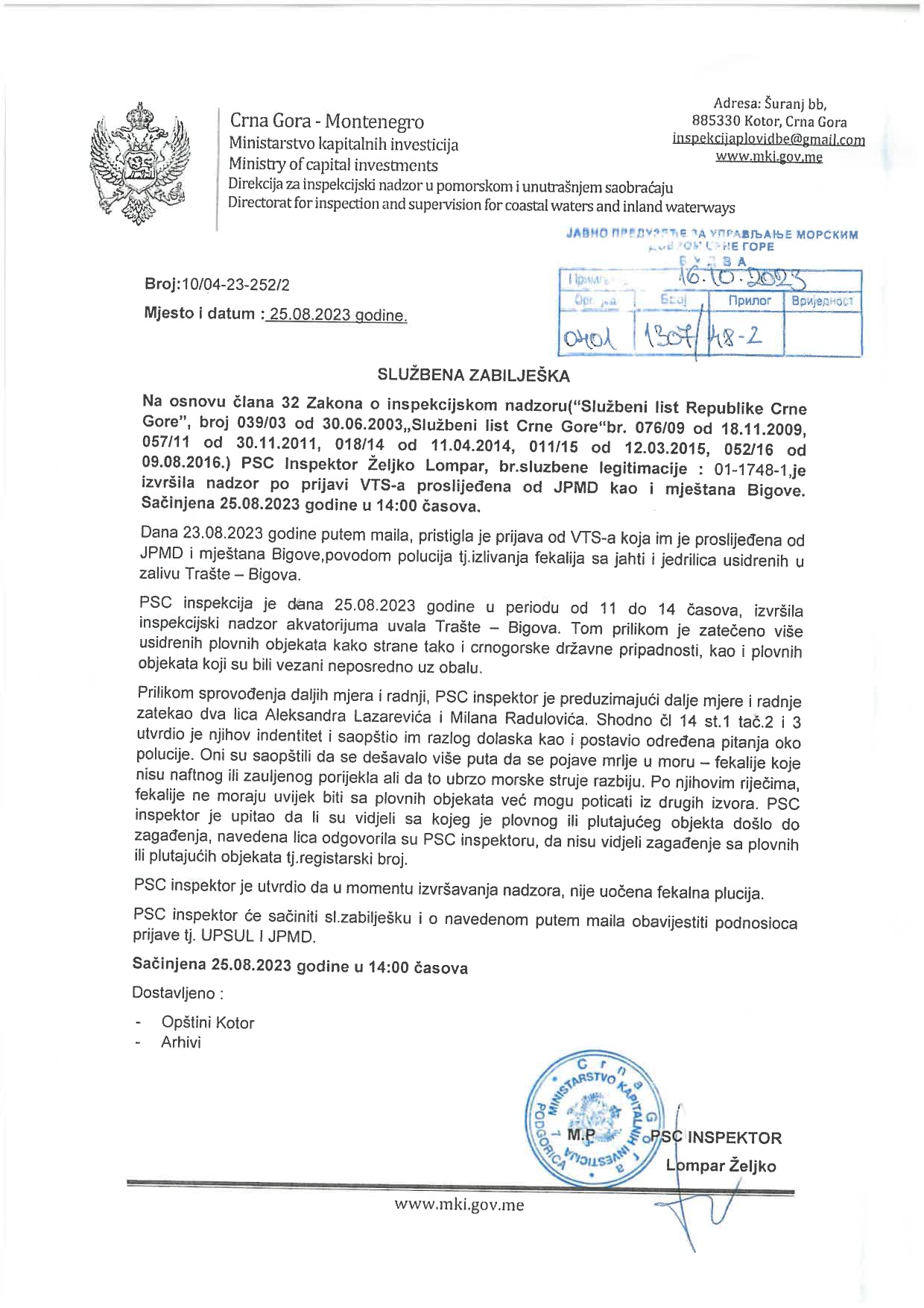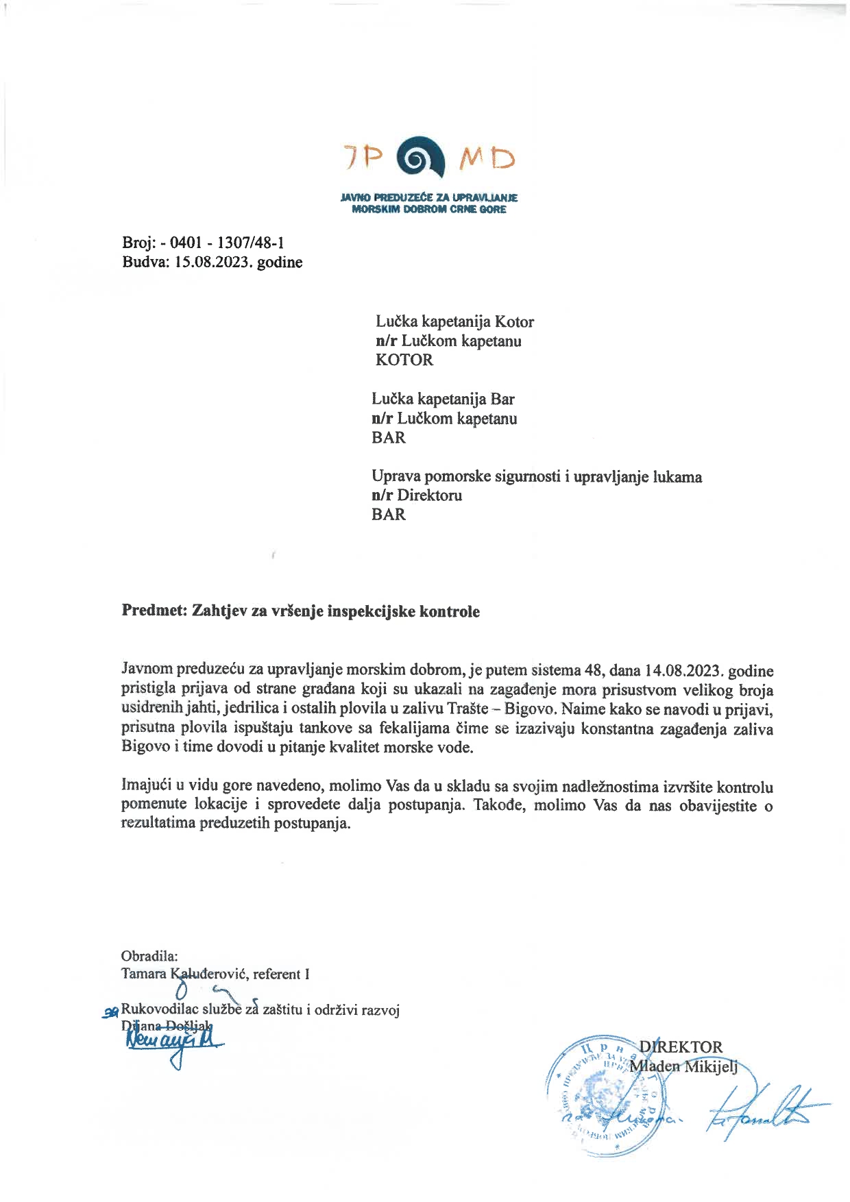 Veliki broj usidrenih jahti, jedrilica i ostalih plovila u zalivu Bigovo ispusta tankove sa fekalijama čime izazivaju konstantna zagađenja zaliva. U mestu koje volimo i često letujemo svake godine imamo stomačnu infekciju. Molimo za kontrolu i sankcionisanje plovila koja ispuštaju tankove. Takođe vas molimo za kontrolu kvaliteta vode i javno izjašnjenje o njoj.